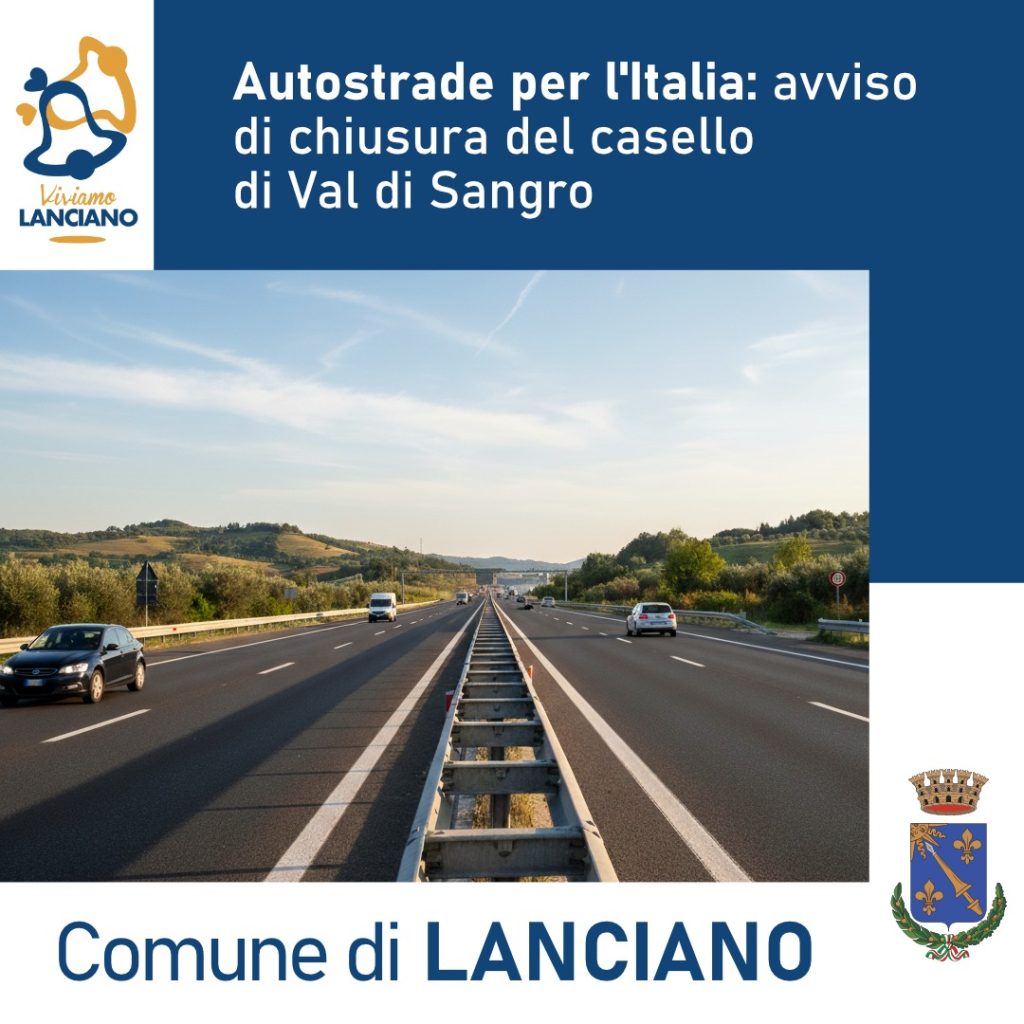Autostrade per l’Italia comunica che, per lavori urgenti di pavimentazione, lo svincolo di Val di Sangro sarà chiuso dalle 23:00 del 6 novembre alle 5:00 del 7 novembre 2025.