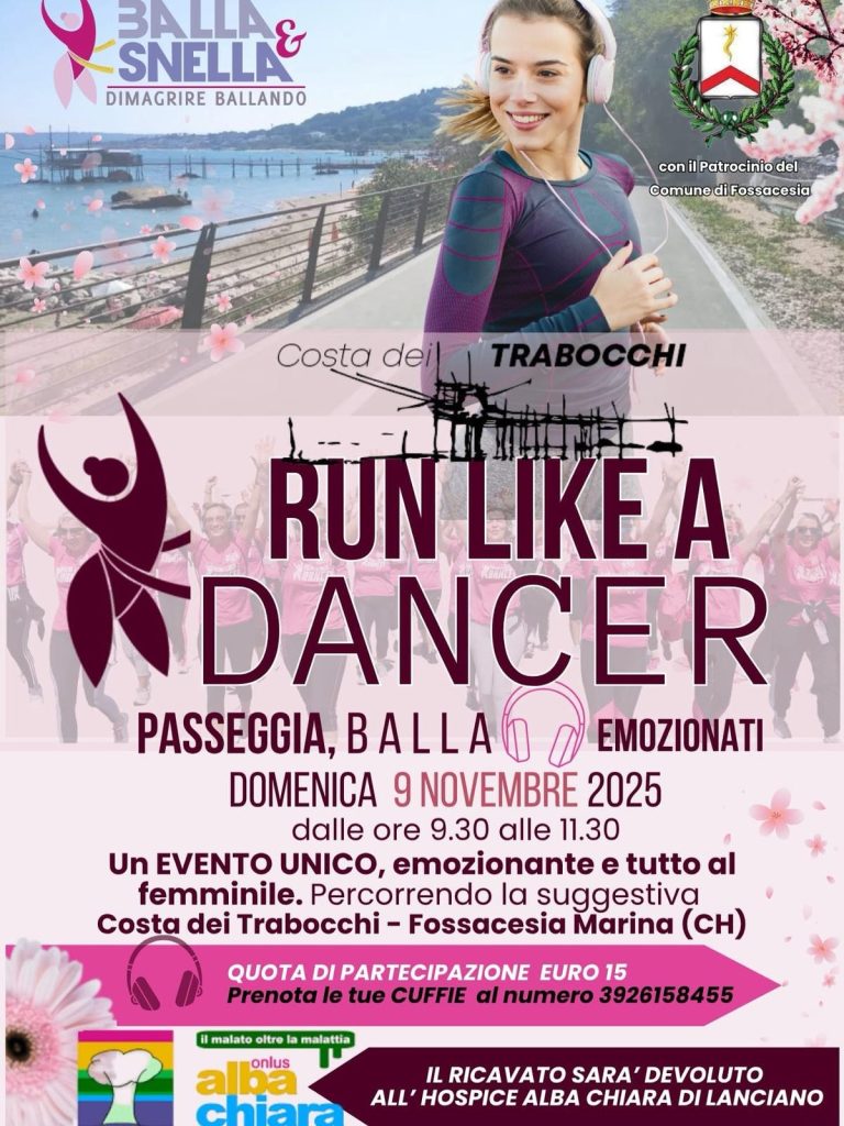 Lo sport a servizio della salute, del benessere e della solidarietà. Questo il senso di “Run like a dancer”, l’evento in programma domenica 9 novembre a Fossacesia Marina, promosso da Balla & snella, il programma di esercizi a corpo libero ballati e coreografati per le donne di tutte le età che vogliono tenersi in forma e senza soffrire.