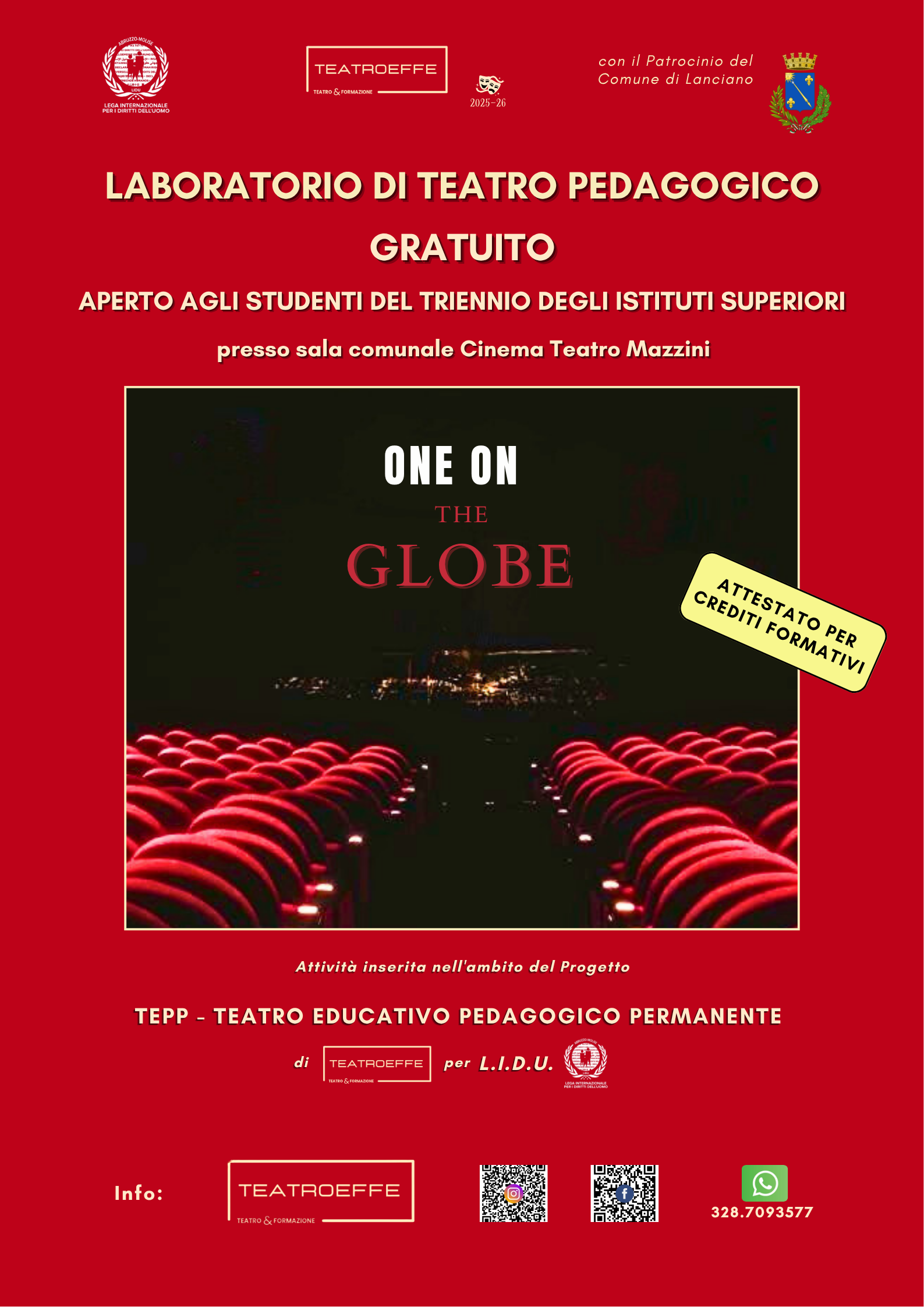 Si e tenuta giovedì 6 Novembre, presso ii Cinema Teatro Mazzini di Lanciano, il primo incontro del laboratorio TEPP – Teatro Educative Pedagogico Permanente, ideato e condotto dalla fondatrice di TeatroEffe Paola Di Diego per la L.I.D.U. – Lega lnternazionale per i Diritti dell’Uomo Abruzzo e Molise.