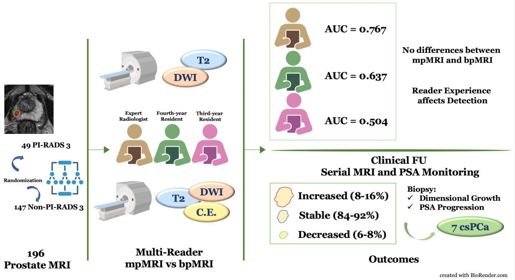 Oggetto di valutazione è stato l’impiego della risonanza magnetica biparametrica, una tecnica di imaging che evita la somministrazione del mezzo di contrasto nel monitoraggio delle lesioni prostatiche PI-RADS 3, vale a dire quelle di livello intermedio tra presenza e assenza di tumore, una sorta di “zona grigia” che ha necessità di approfondimento.