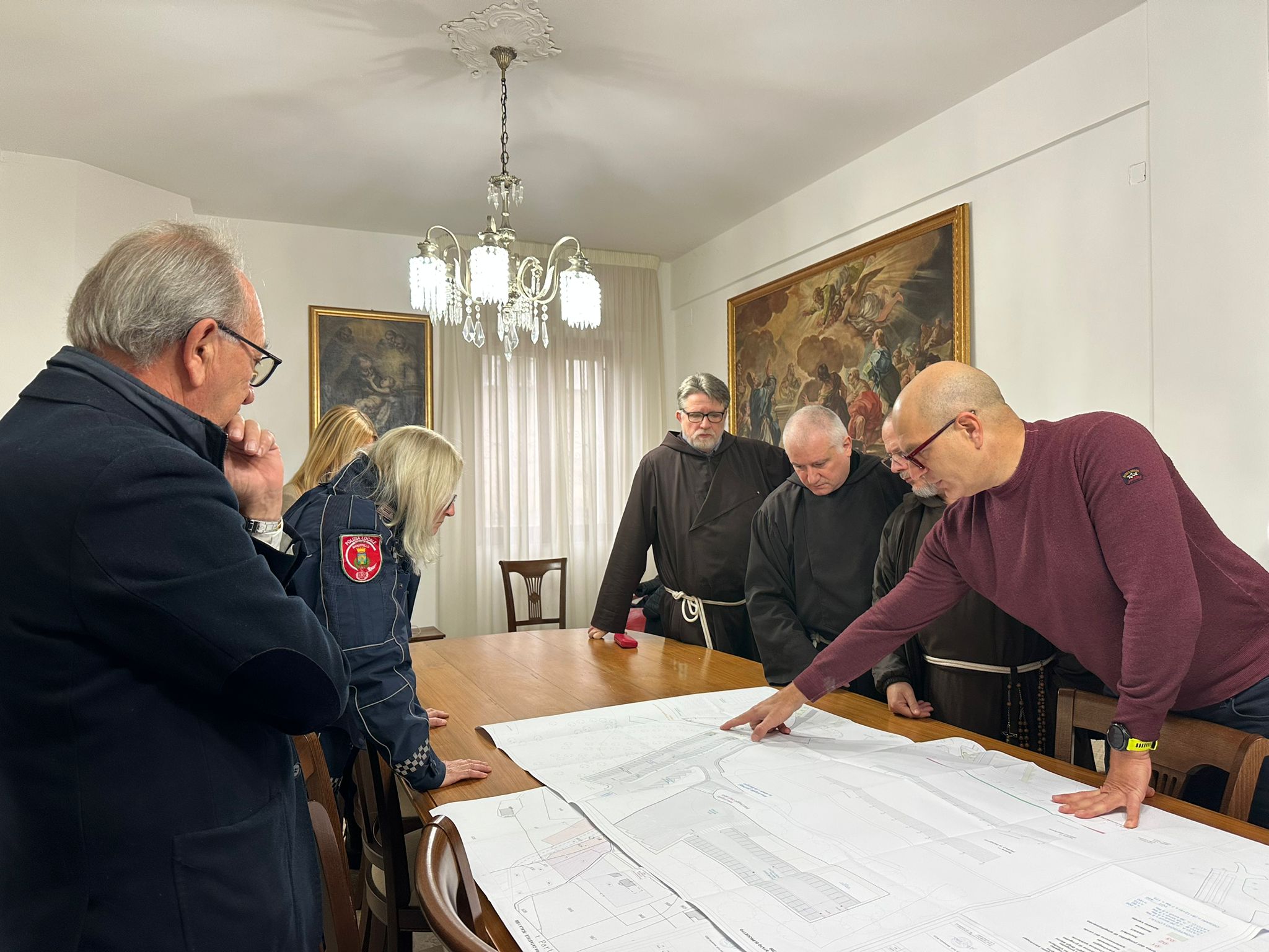 All’incontro con il progettista, l’architetto Alessandro Iezzi, hanno preso parte, per il Comune, il sindaco Giorgio De Luca, il vicesindaco Giulia De Lellis e la responsabile della Polizia Locale Simonetta Clivio, accolti dal rettore della Basilica frate Antonio Gentili e da frate Mariano Michniak, guardiano del Convento dei Frati Cappuccini. Con loro erano presenti Simone Calvarese, ministro della Provincia Serafica dell’Immacolata Concezione dei Frati Cappuccini del Centro Italia e padre Paolo Palombarini.