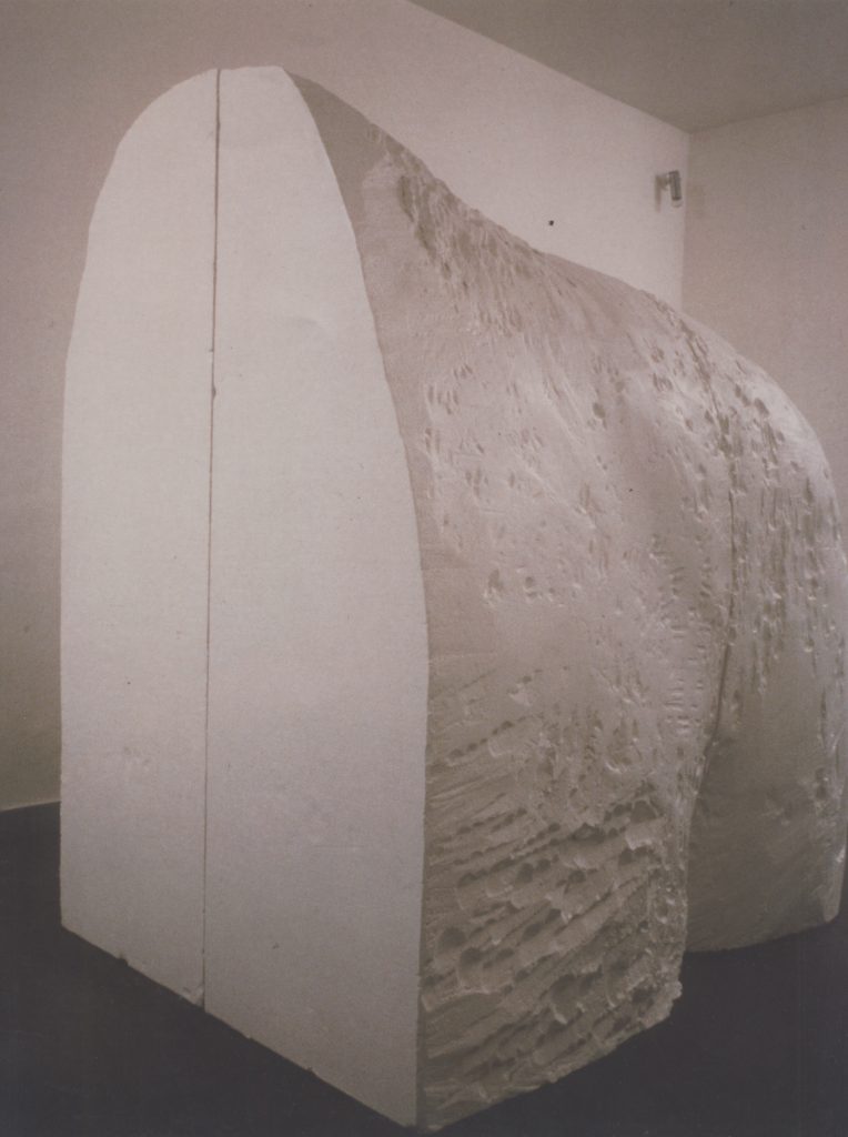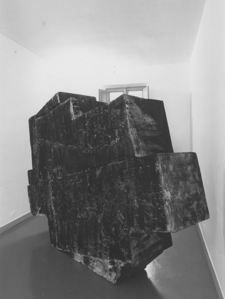 Apre la rassegna La Spalla, una scultura che sembra avere due momenti, un lato prospetticamente levigato, piatto, che evidenzia l’assemblaggio dei blocchi, un altro sbozzato e smussato, tracciando le linee di un’ipotetica forma in formazione. Le altre opere in mostra, apparse per la prima volta nell’esposizione Arte dello Squallore nella Galleria di Giorgio Persano nel 1985 e nel 1986 proprio nella Galleria Pieroni di Roma, sono costituite da superfici e volumi dai colori scuri e cupi, grandi blocchi di poliuretano. L’artista ha spesso utilizzato per questi lavori anche l’espressione “materiale anonimo”, lavori che stanno in un campo indefinito tra pittura e scultura.