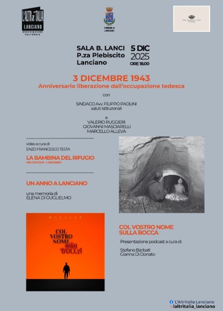 La serata si concluderà con la presentazione in anteprima del podcast “Con il Vostro Nome sulla Bocca”. Un racconto avvincente che copre i nove mesi di guerra dall’arrivo dei tedeschi (settembre ’43) fino alla fine dei bombardamenti (giugno ’44). Il podcast sarà disponibile dal 2026 ed è stato realizzato con il contributo del Comune di Lanciano.