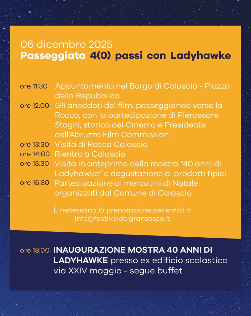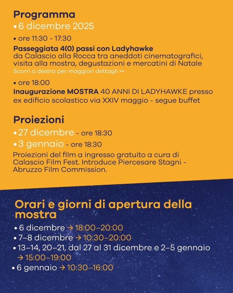 La giornata inaugurale del 6 dicembre sarà arricchita dalla Passeggiata “4(0) passi con Ladyhawke”, un itinerario che condurrà dalla parte bassa del paese fino alla rocca, tra aneddoti cinematografici, narrati da studiosi e professionisti dell’Abruzzo Film Commission, e visite guidate agli spazi espositivi allestiti per l’occasione. Durante la giornata sono previsti momenti dedicati ai prodotti tipici, ai mercatini di Natale e alla visita in anteprima della mostra.