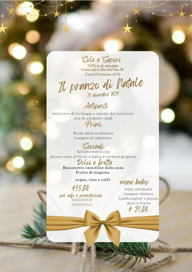 Per Natale, Sole e Sapori propone un’anteprima del menù delle feste, un invito a scoprire le prelibatezze della tradizione: formaggi e salumi del territorio, primi caldi e succulenti arrosti, dolci che sanno di casa e di ricordi.