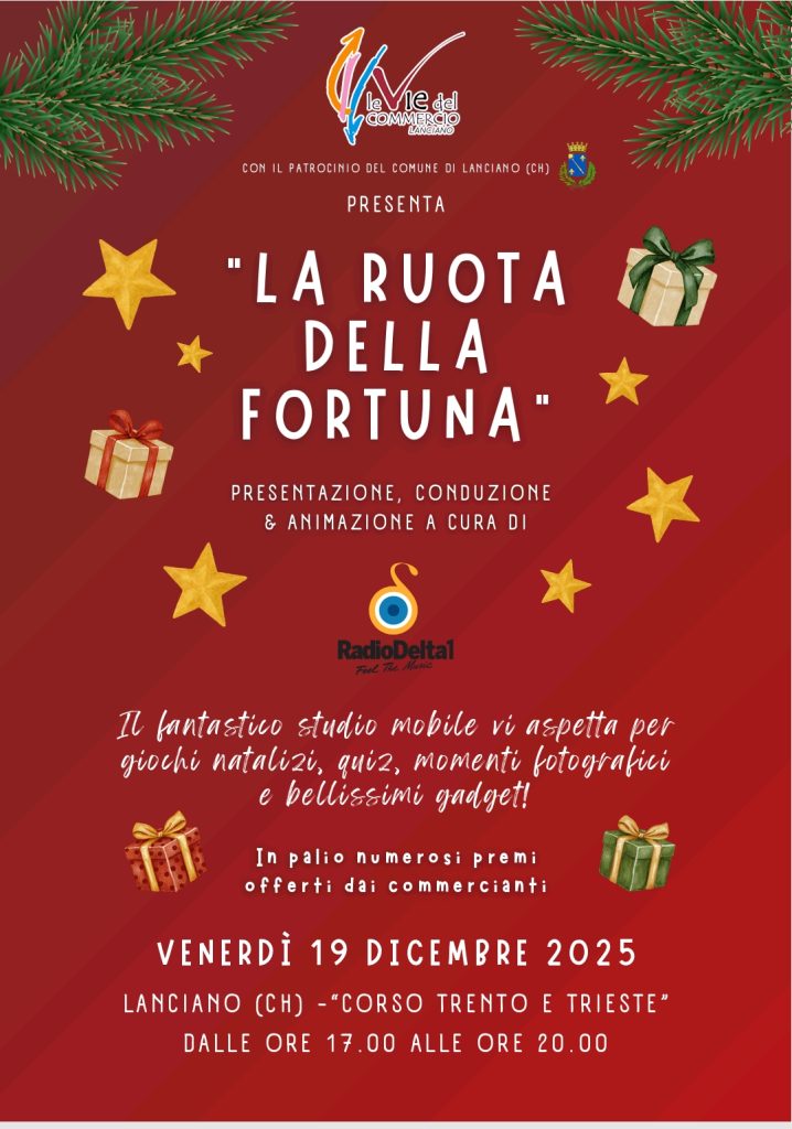 Le Vie del Commercio di Lanciano, con il patrocinio del Comune, presentano un evento speciale pensato per animare il periodo natalizio e coinvolgere grandi e piccini: “La Ruota della Fortuna”. L’iniziativa, che si terrà venerdì 19 dicembre 2025 lungo Corso Trento e Trieste, promette divertimento, premi e tanta atmosfera festiva.