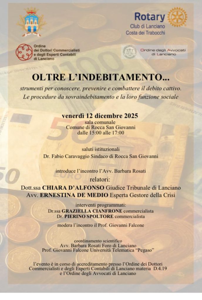 Venerdi 12 dicembre dalle ore 15 presso la Sala Consiliare del Comune di Rocca San Giovanni, il Rotary Club Lanciano Costa dei Trabocchi, organizza il Convegno dal titolo “OLTRE L’INDEBITAMENTO – STRUMENTI PER CONOSCERE, PREVENIRE E COMBATTERE IL DEBITO CATTIVO. LE PROCEDURE DA SOVRAINDEBITAMENTO E LA LORO FUNZIONE SOCIALE“