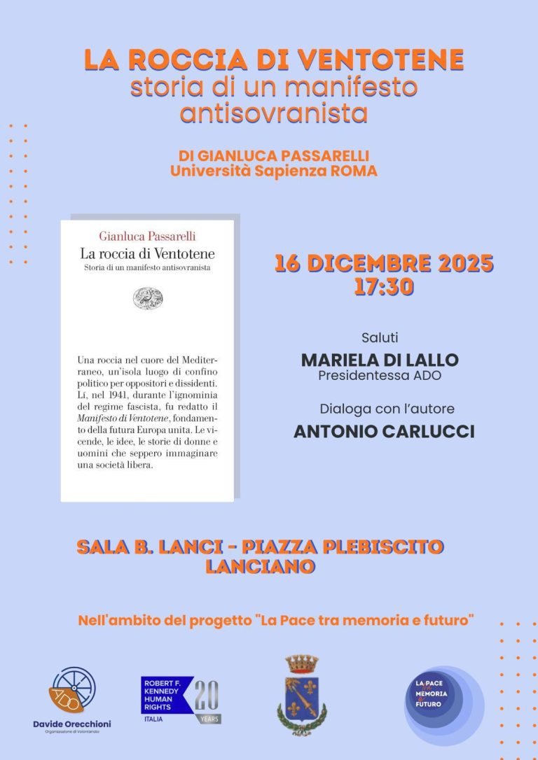 A portare i saluti istituzionali sarà Mariela Di Lallo, presidentessa dell’associazione ADO, promotrice dell’appuntamento. A dialogare con l’autore sarà Antonio Carlucci, che accompagnerà il pubblico in un percorso attraverso la genesi, i contenuti e l’eredità del celebre Manifesto di Ventotene, redatto nel 1941 da Altiero Spinelli ed Ernesto Rossi durante il confino imposto dal regime fascista.