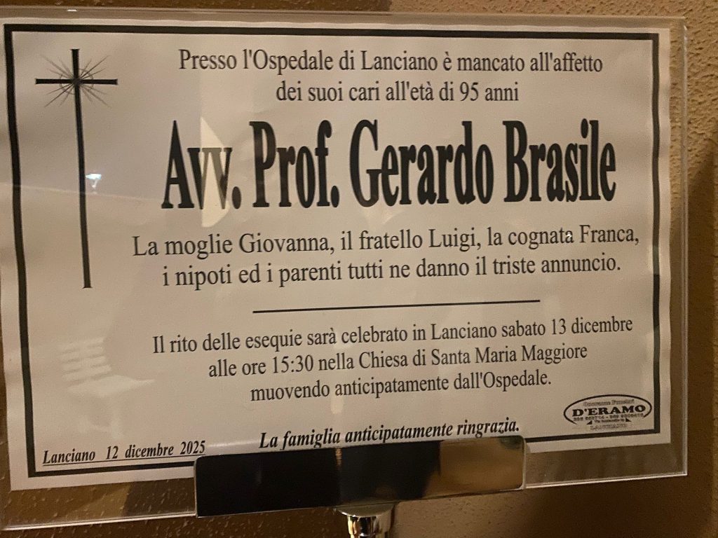 La sua scomparsa lascia un vuoto profondo, non solo nel foro lancianese ma nella comunità tutta. Con Gerardo Brasile se ne va un testimone di un’altra epoca, fatta di rispetto, sobrietà e responsabilità, valori che continuano a vivere nel ricordo di quanti lo hanno conosciuto e stimato.