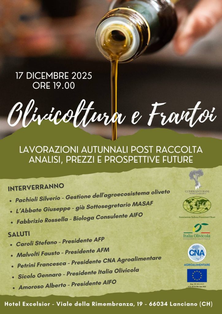 Si terrà oggi, mercoledì 17 dicembre alle ore 19.00, presso l’Hotel Excelsior di Lanciano l’incontro “Olivicoltura e Frantoi – Lavorazioni autunnali post raccolta, analisi, prezzi e prospettive future”, un appuntamento pensato per offrire a olivicoltori, frantoiani e operatori del settore una lettura delle dinamiche agronomiche, produttive e di mercato della campagna di raccolta.