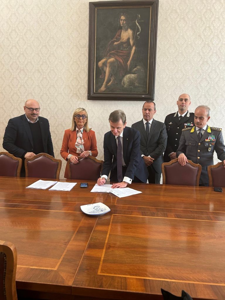 CHIETI- Il Prefetto Gaetano Cupello ha sottoscritto con il presidente di Confcommercio Chieti, Marisa Tiberio e il direttore Provinciale di Confesercenti Chieti, Lido Legnini, alla presenza del vicario del Questore, Pierfrancesco Muriana e dei comandanti provinciali dei Carabinieri e della Guardia di Finanza, Cosimo Di Caro e Massimo Otranto, il Protocollo d’intesa video-allarme antirapina.