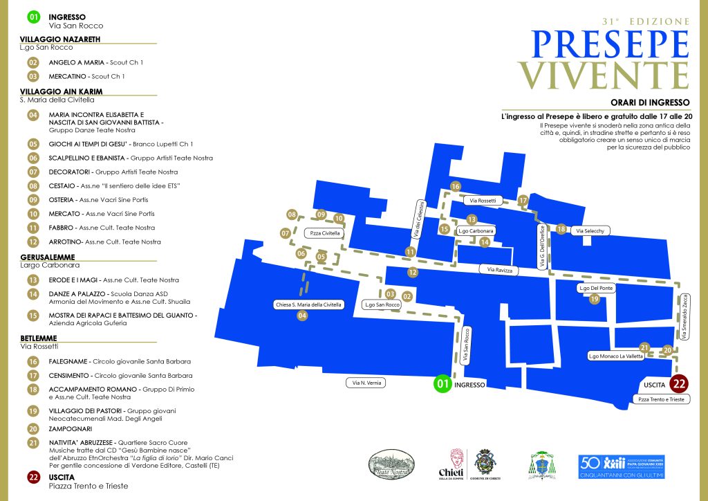 L’ingresso sarà da via San Rocco, lungo la discesa di via Nicoletto Vernia; il percorso salirà fino alla chiesa della Civitella e scenderà poi fino alla capanna allestita in Largo Monaco La Valletta, con uscita verso Piazza Trento e Trieste. La Sacra Famiglia sarà interpretata da Ferdinando Clemente nel ruolo di Giuseppe, Filomena D’Alessandro come Maria e dal piccolo Luigi Clemente nel ruolo di Gesù Bambino.