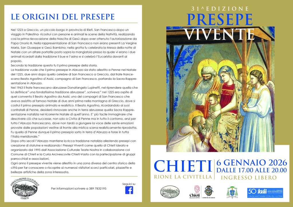 E’ un appuntamento immancabile che si terrà il 6 gennaio: torna anche quest’anno il presepe vivente, giunto alla 31 edizione, a cura dell’associazione Teate Nostra in sinergia del Comune.