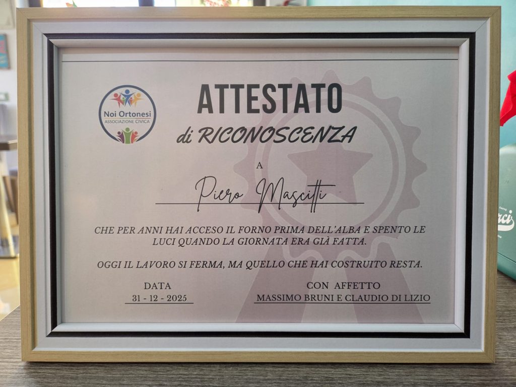 “Un lavoro fatto di continuità, cura e presenza costante, quando ancora i mestieri si imparavano con il tempo e si onoravano con i fatti- spiegano massimo Bruni e Claudio Di Lizio dell’associazione civica Noi ortonesi che hanno congegnato una targa a Mascitti- Quarantacinque anni significano albe anticipate, mani infarinate, forni accesi quando la città dormiva.