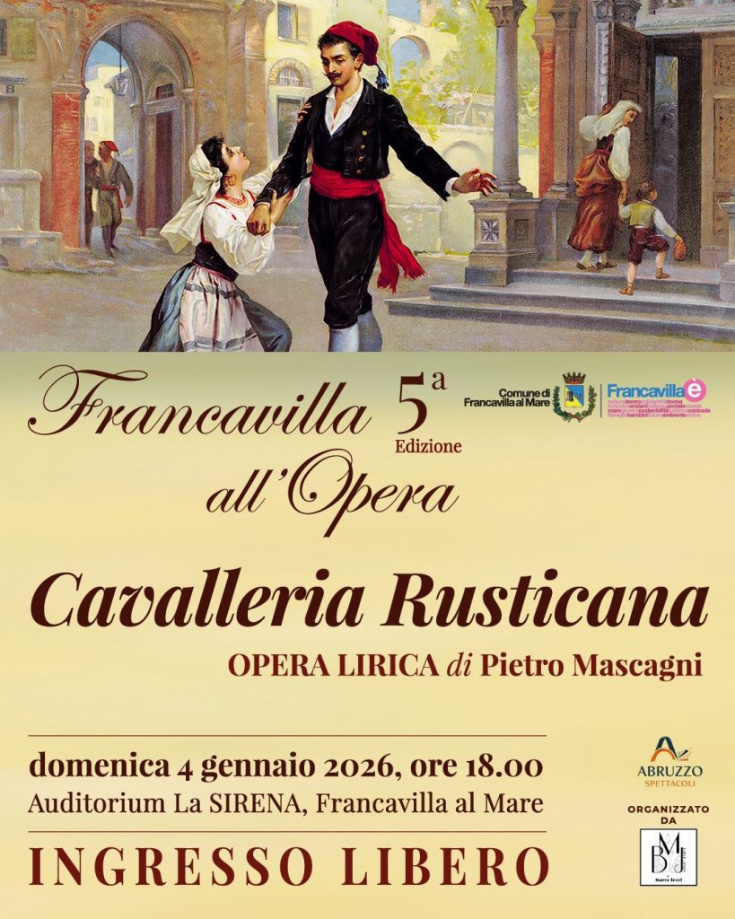 FRANCAVILLA AL MARE- Appuntamento con la quinta edizione di “Francavilla all’Opera” che si svolge, per la prima volta in inverno. Domenica, alle ore 18 l’Auditorium Sirena ospiterà per la prima volta la Cavalleria Rusticana di Pietro Mascagni, in forma di concerto con solisti, coro e pianoforte.