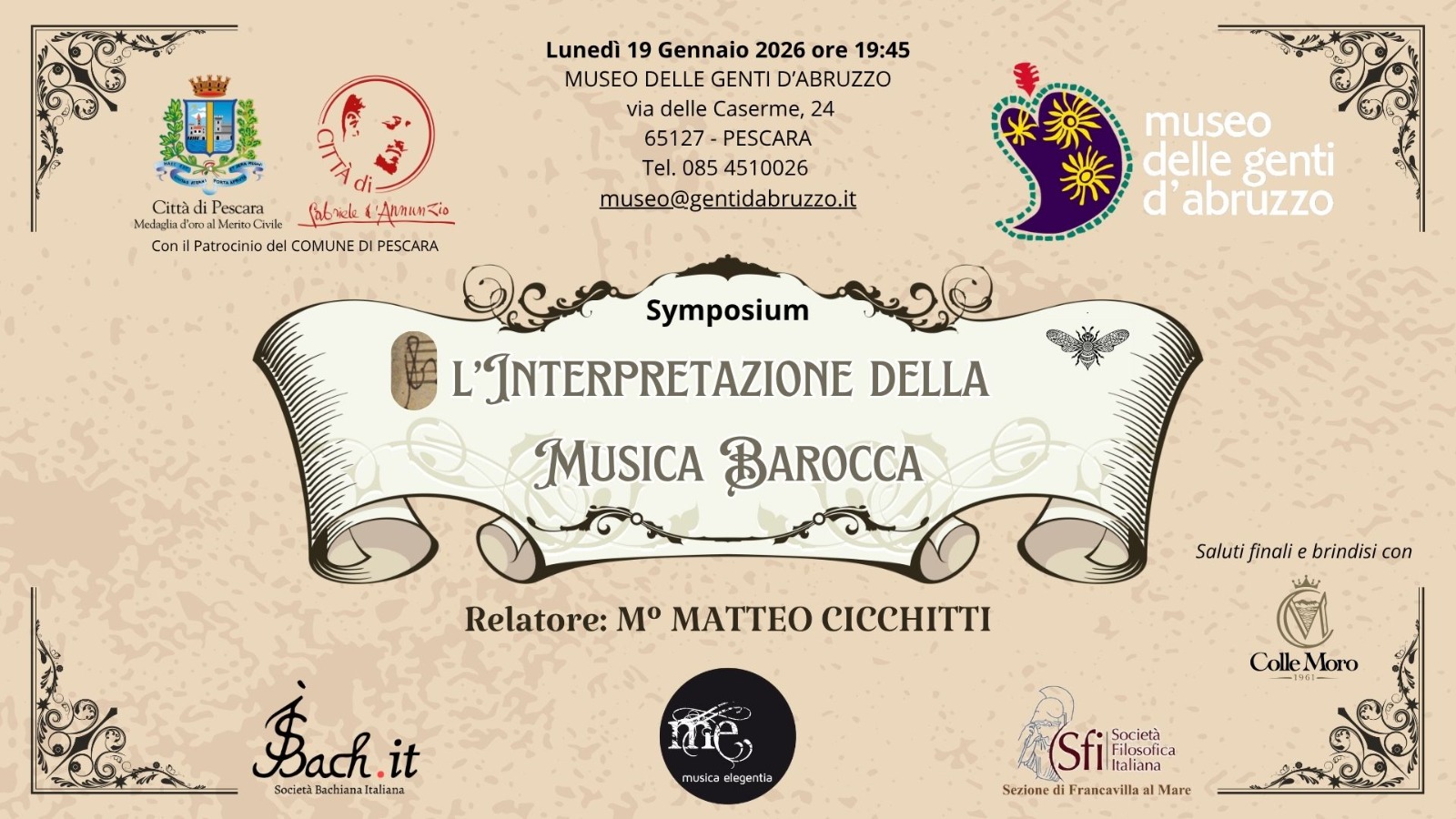 Il tour si aprirà lunedì 19 gennaio 2026 ore 19:45 a Pescara presso il Museo delle Genti d’Abruzzo con un evento di approfondimento: il Symposium intitolato “L’interpretazione della musica barocca”. Un’occasione preziosa per musicisti, studenti e appassionati per ascoltare direttamente il Maestro Cicchitti sui segreti e le sfide della musica antica oggi.
