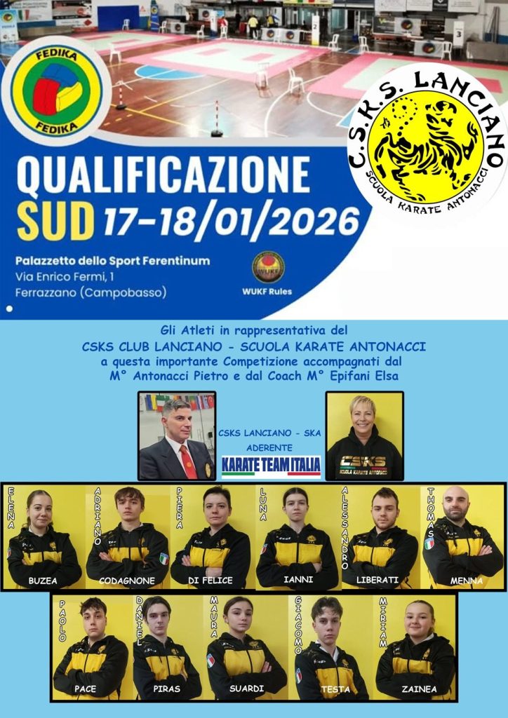 A rappresentare Lanciano ci sarà la storica e blasonata squadra del Csks, scuola di karate guidata dal maestro Pietro Antonacci e dal coach maestro Elsa Epifani. Il team frentano è composto dai seguenti atleti: Elena Buzea, Adriano Codagnone, Piera Di Felice, Luna Ianni, Alessandro Librerati, Thomas Menna, Paolo Pace, Daniel Piras, Maura Suardi, Giacomo Testa, Miriam Zainea.
