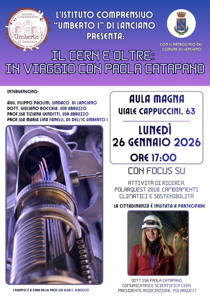 Un viaggio nel cuore della ricerca scientifica arriva all’Istituto Comprensivo “Umberto I” di Lanciano. Lunedì 26 gennaio, dalle 17:00 alle 19:00, l’Aula Magna della scuola ospiterà la Dott.ssa Paola Catapano, fisica di fama internazionale e ricercatrice al CERN di Ginevra, il laboratorio europeo di fisica delle particelle.