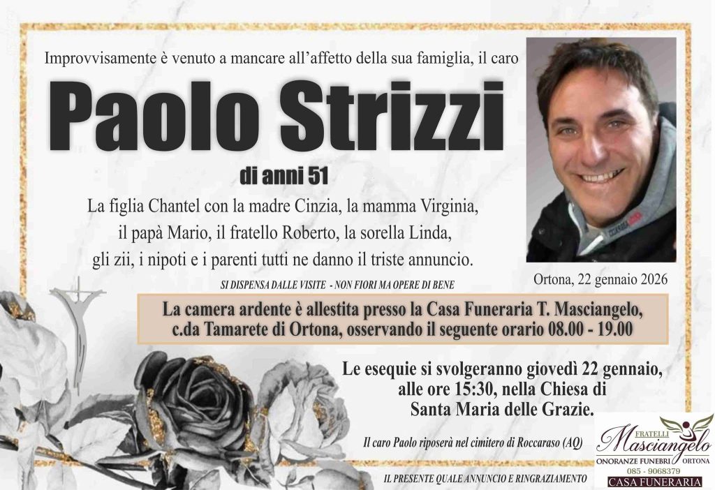 Oggi, 22 gennaio ad Ortona, nella chiesa di Santa Maria delle Grazie, a partire dalle ore 15.30 ci saranno le esequeie di Paolo Strizzi, l’operaio di 51 anni morto domenica scorsa, a causa di un malore, nella sua casa di Rocca San Giovanni.