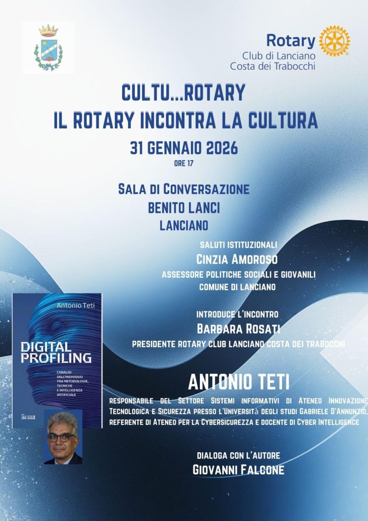 Sabato 31 gennaio alle ore 16 presso la Sala Benito Lanci di Lanciano si terrà la presentazione dell’ultimo libro di Antonio Teti dal titolo “Digital profiling L’analisi dell’individuo tra metodologie, tecniche e intelligenza artificiale” (edizione il Sole 24 ore), evento organizzato dal Rotary Club Lanciano Costa dei Trabocchi con il patrocinio del Comune di Lanciano.