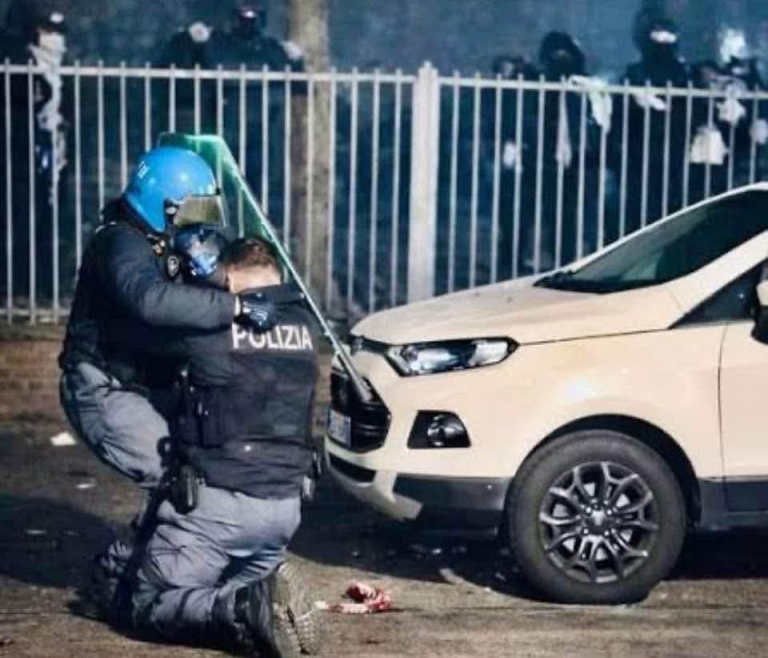 In un primo momento alcuni aggressori sembrano essersi allontanati, ma la furia non si è arrestata: nuovi colpi, altra violenza. L’agente, visibilmente stordito, si è portato più volte le mani alla testa, probabilmente per il dolore o per rendersi conto delle conseguenze dell’assalto. Solo l’intervento dei colleghi, che hanno fatto scudo attorno a lui, ha evitato conseguenze ancora più gravi e ha permesso di sottrarlo al pestaggio.
