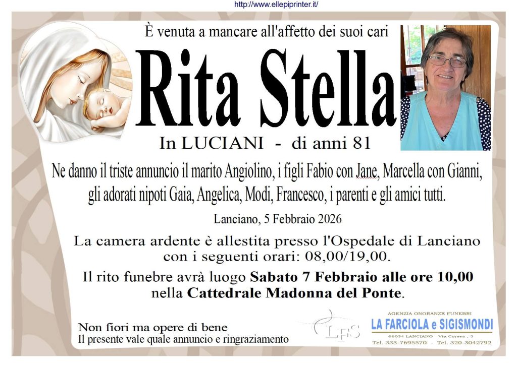 Si è spenta oggi all’ospedale “F.Renzetti” di Lanciano all’età di 81 anni Rita Stella, da tutti conosciuta con affetto e semplicemente con il nomignolo di “Rita la fruttivendola”. La camera ardente è allestita presso il nosocomio frentano e le esequie si terranno sabato 7 febbraio alle ore 10 nella cattedrale Madonna del Ponte.