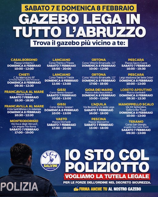 Domani, sabato 7, e domenica 8 febbraio la Lega torna nelle principali abruzzesi con i gazebo nell’ambito della campagna nazionale ‘Io sto col poliziotto’ a sostegno delle forze dell’ordine e per esprimere loro solidarietà dopo i gravi fatti avvenuti a Torino e Milano.