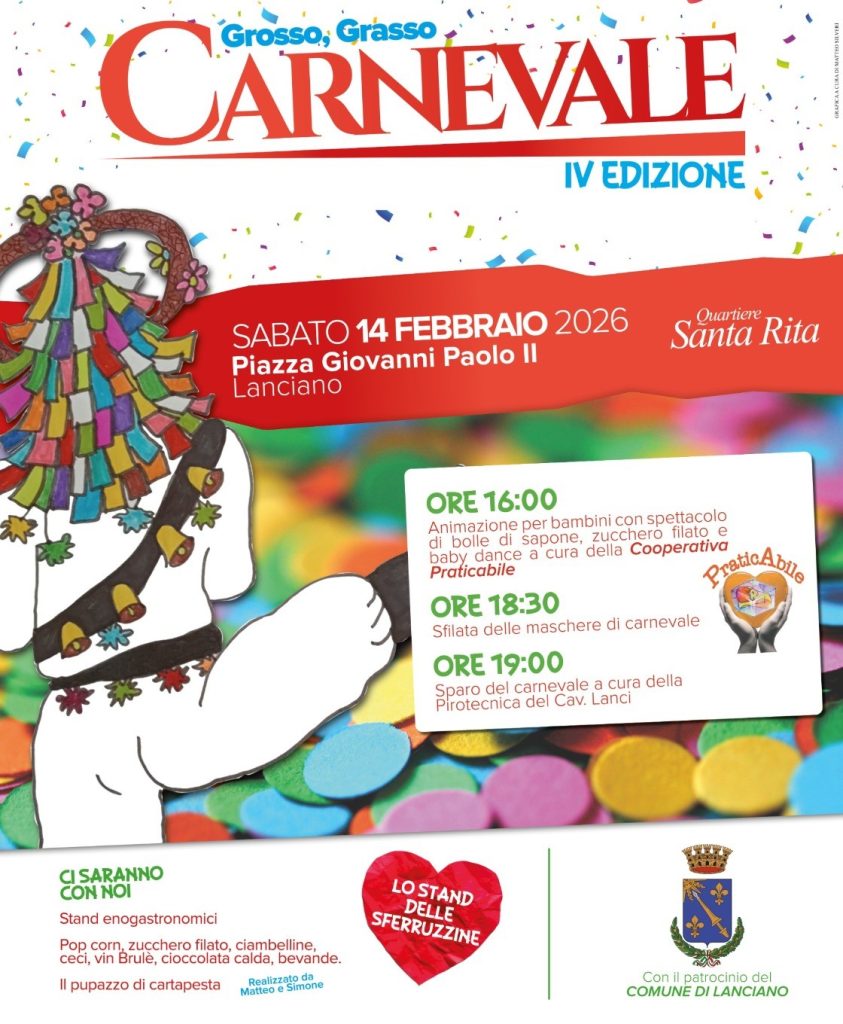 Quando un’intera comunità di quartiere dà spazio a colori, musica, giochi, buon cibo e tanto divertimento, torna il Grosso Grasso Carnevale al quartiere Santa Rita di Lanciano. Giunto alla quarta edizione, l’evento è promosso dall’associazione Omnis Terra APS in collaborazione con la parrocchia Spirito Santo e si terrà sabato 14 febbraio a partire dalle ore 16 in piazza Papa Giovanni Paolo II. In caso di pioggia, la festa si svolgerà nella Sala della cultura della parrocchia.