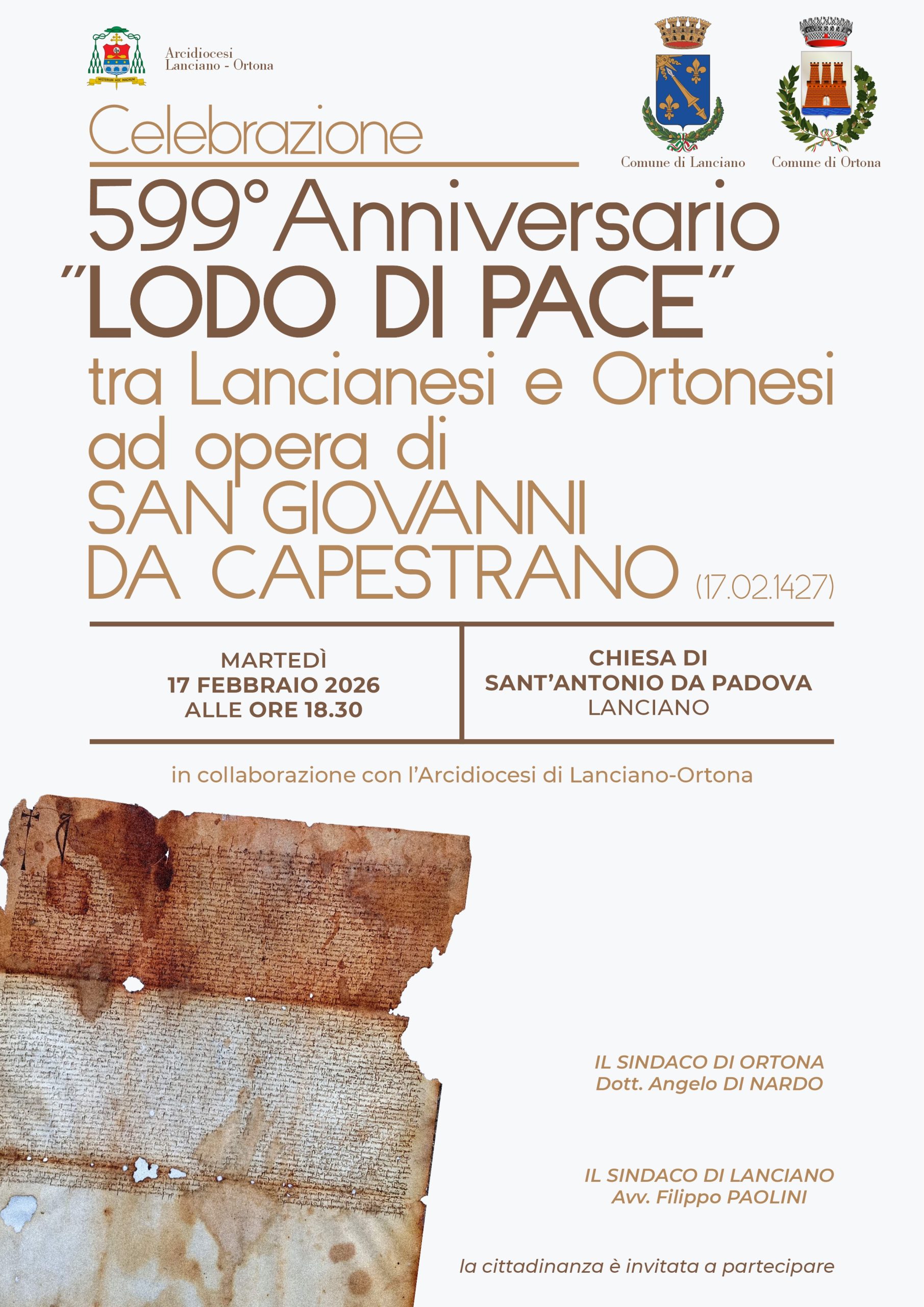 Martedì 17 febbraio alle 18.30, presso la Chiesa di Sant’Antonio da Padova, a Lanciano, il Comune di Lanciano e il Comune di Ortona, in collaborazione con l’Arcidiocesi di Lanciano-Ortona, celebreranno il 599° Anniversario del “Lodo di Pace”, siglato tra lancianesi e ortonesi, ad opera di San Giovanni da Capestrano, il 17 febbraio 1427.