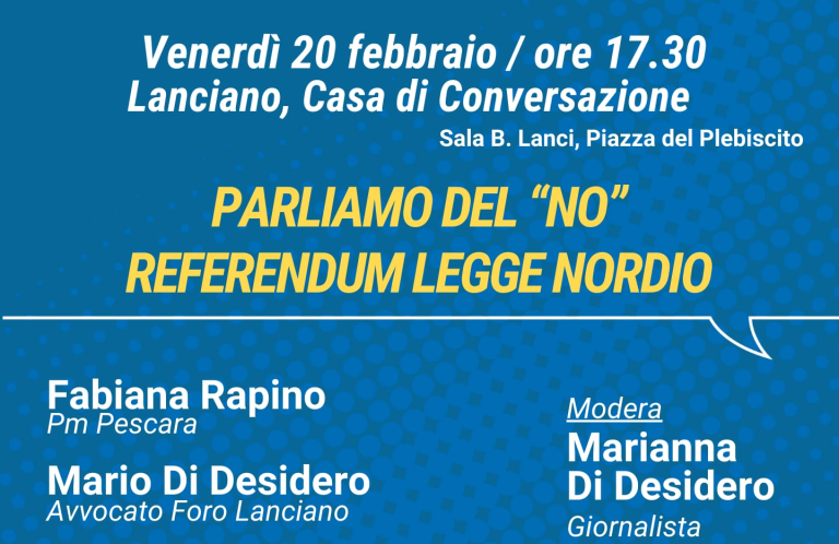 Venerdì 20 febbraio alle ore 17.30, presso la Casa di Conversazione di Lanciano (Sala B. Lanci, Piazza del Plebiscito), si terrà un incontro pubblico dal titolo “Parliamo del ‘No’ – Referendum Legge Nordio”. L’iniziativa sarà un’occasione di confronto e approfondimento sui contenuti del referendum legato alla riforma della giustizia, con particolare attenzione alle ragioni del “No”.