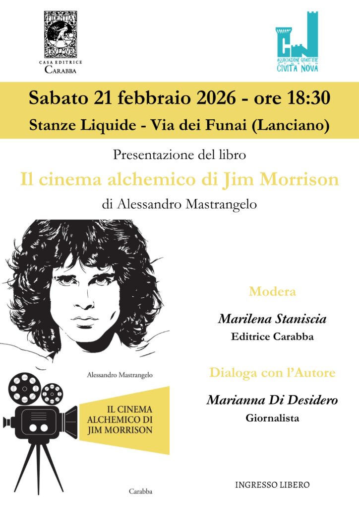 Sabato 21 febbraio 2026, alle ore 18.30, negli spazi di Stanze Liquide in via dei Funai a Lanciano, si terrà la presentazione del libro “Il cinema alchemico di Jim Morrison” di Alessandro Mastrangelo, pubblicato da Carabba.