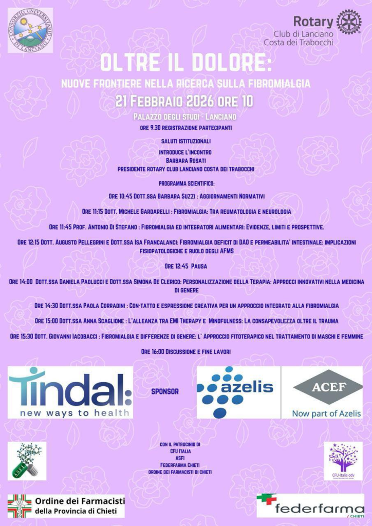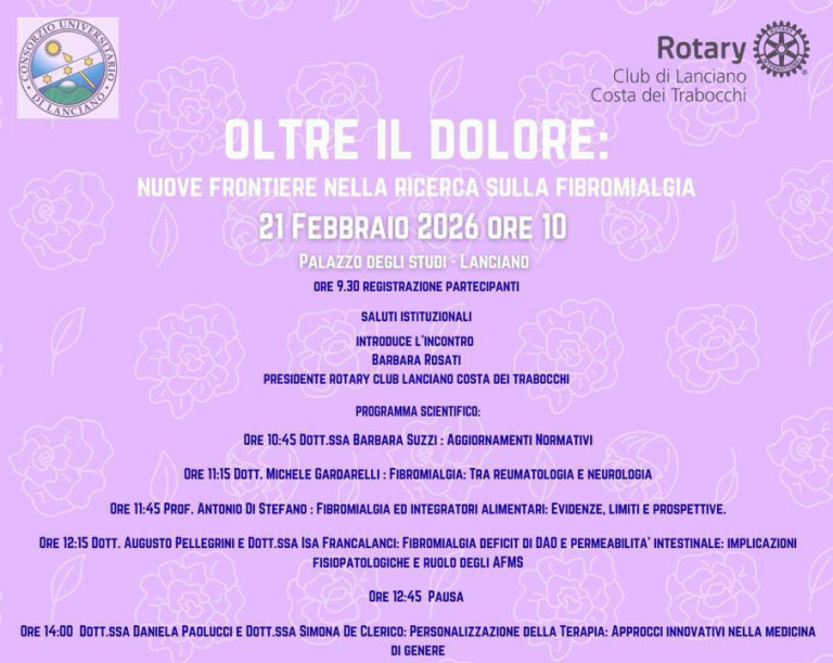 Lanciano – “Oltre il dolore: nuove frontiere nella ricerca sulla fibromialgia” è il titolo del convegno nazionale scientifico promosso dal RC Lanciano Costa dei Trabocchi, presieduto dall’avvocato Barbara Rosati.