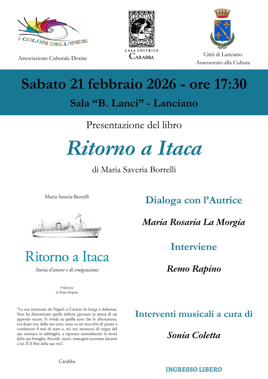 “Ritorno a Itaca, Storia d’amore e di emigrazione” edito dalla casa editrice Carabba di Lanciano, sarà presentato nella sala “Benito Lanci” della Casa di Conversazione, sabato prossimo 21 Febbraio, alle 17.30. Dialogherà con l’autrice Maria Rosaria La Morgia, sono previsti intermezzi musicali di Sonia Coletta e l’intervento di Remo Rapino. L’incontro è organizzato dall’associazione culturale donne “I colori dell’Iride” con il patrocinio dell’assessorato alla Cultura del Comune di Lanciano.